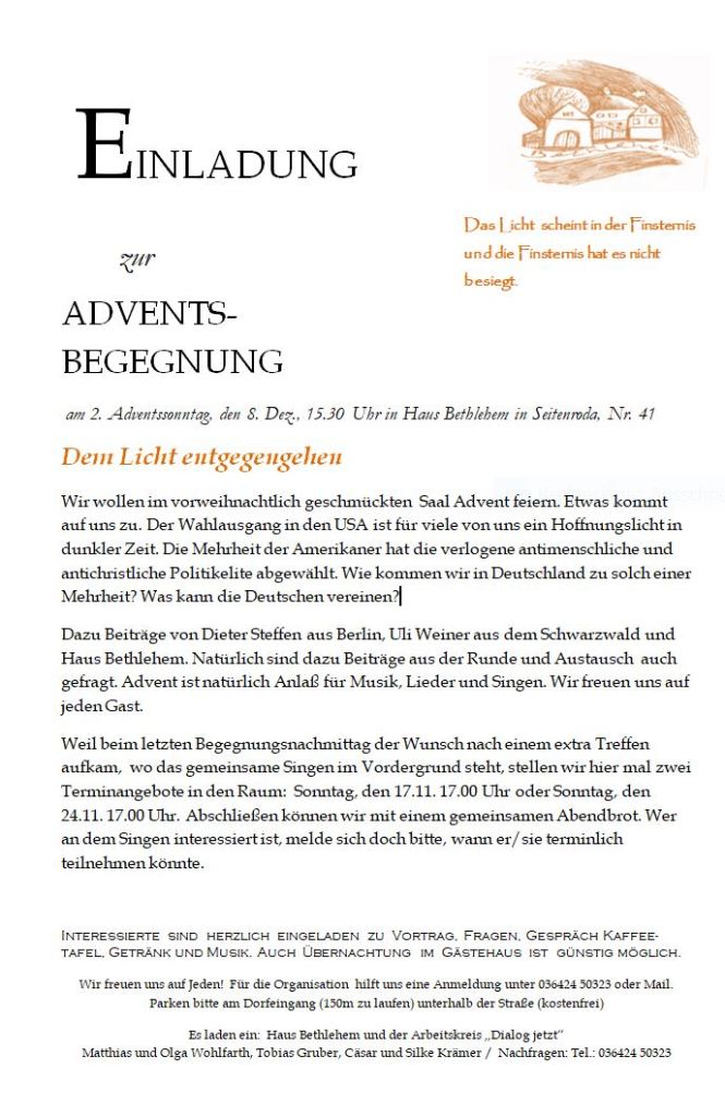 ADVENTS- BEGEGNUNG am 2. Adventssonntag, den 8. Dez., 15.30 Uhr in Haus Bethlehem in Seitenroda, Nr. 41 Dem Licht entgegengehen Wir wollen im vorweihnachtlich geschmückten Saal Advent feiern. Etwas kommt auf uns zu. Der Wahlausgang in den USA ist für viele von uns ein Hoffnungslicht in dunkler Zeit. Die Mehrheit der Amerikaner hat die verlogene…