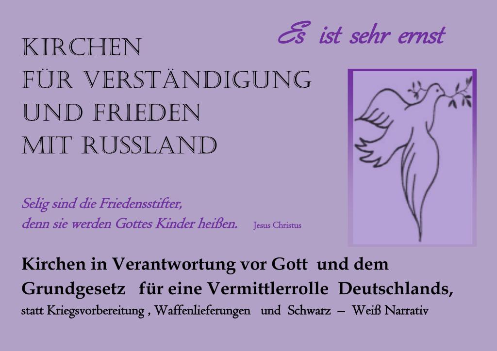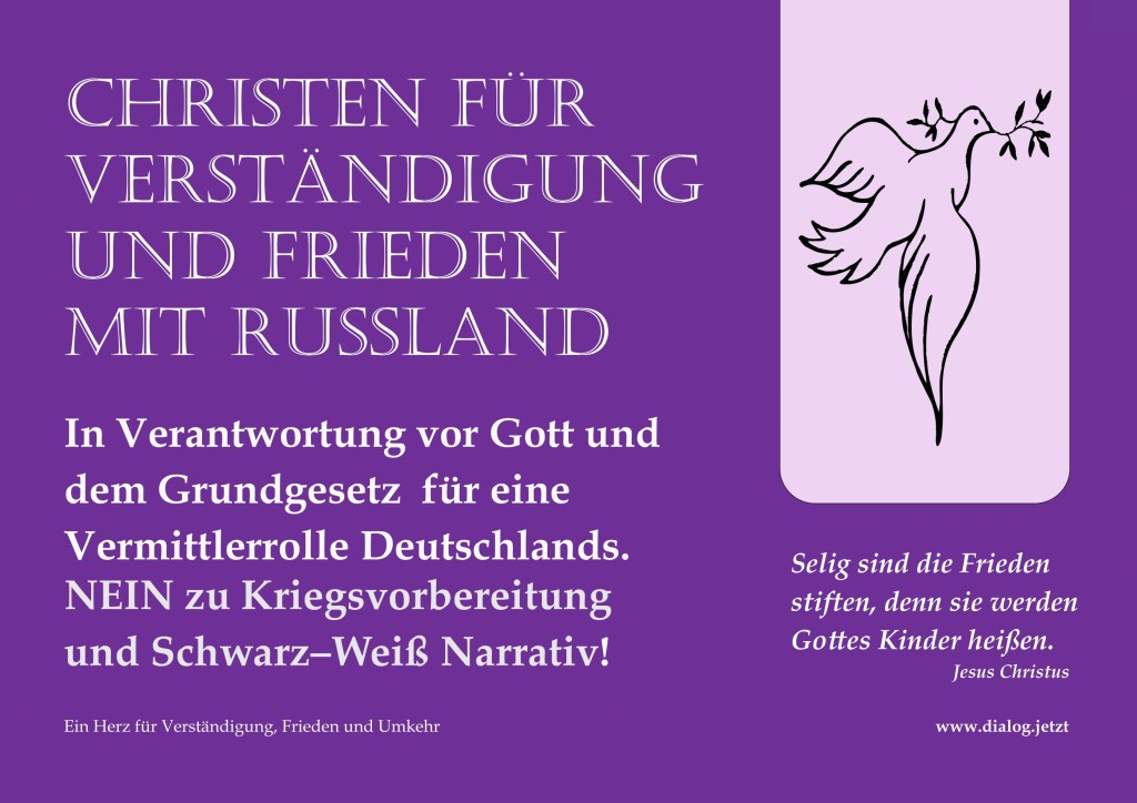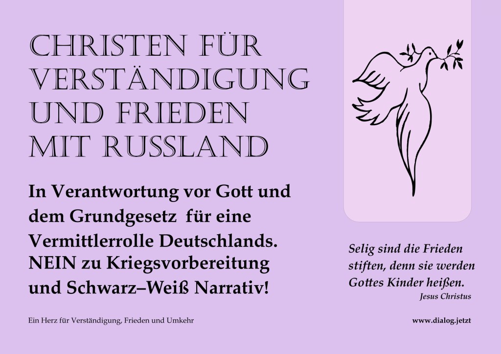 für Frieden mit Russland – für Frieden mit Russland – aktiv werden und deutschlandweit verbreiten ! Liebe Leser, die Texte und Plakate, sowie Druckvorlagen für Großplakate könnt Ihr Euch hier herunterladen und kreativ verwerten, verbreiten usw. Auch haben wir Informationen für die Beschaffung von Friedensaufklebern und Fahnen mit Preisbeispielen eingestellt. Vom Reformationstag bis Weihnachten…
