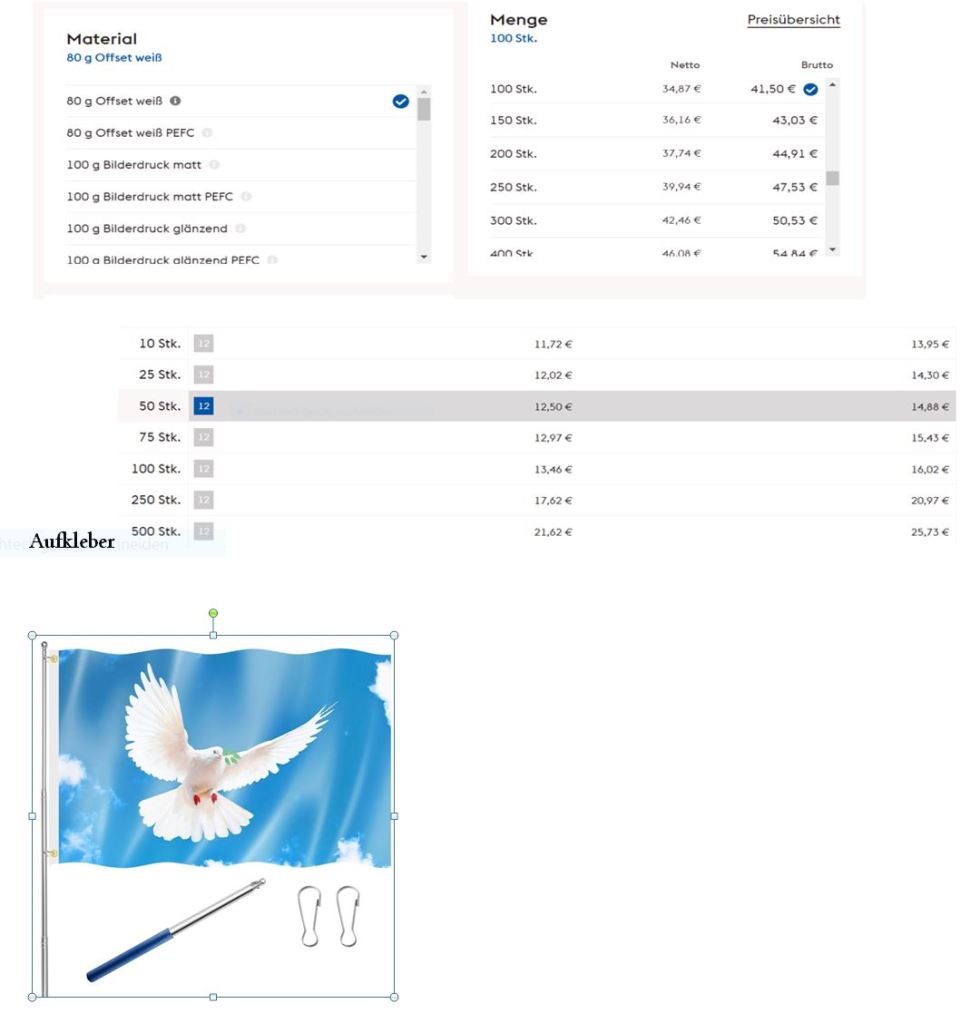 Auf der Webseite von Flyeralarm findet man auch eine ganze Menge Anregungen – von Autoaufklebern bis Flyer und mehr. Obwohl die Preise ab einer Bestellung von 100 Stück schon recht günstig sind, kann man natürlich noch wesentlich sparen, wenn man z.B. 3000 Stück bestellt und in Päckchen von 250 Stück an 10 Abnehmeradressen senden läßt. Man zahlt in diesem Fall nur zusätzliche Versandkosten. Ob sich das zum Schluß wirlkich rechnet, muß man im konkreten Fall abwägen. Preisbeispiel bei https://www.flyeralarm.com/de/, runde Aufkleber 5cm siehe unten. Zu Großplakaten eine Info ganz unten: